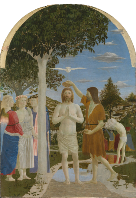 Крещение Христа, Пьеро делла Франческа, 1448–1470 гг.; Мадонна из Сенигаллии, Пьеро делла Франческа, 1474 г.