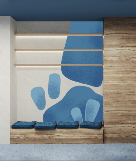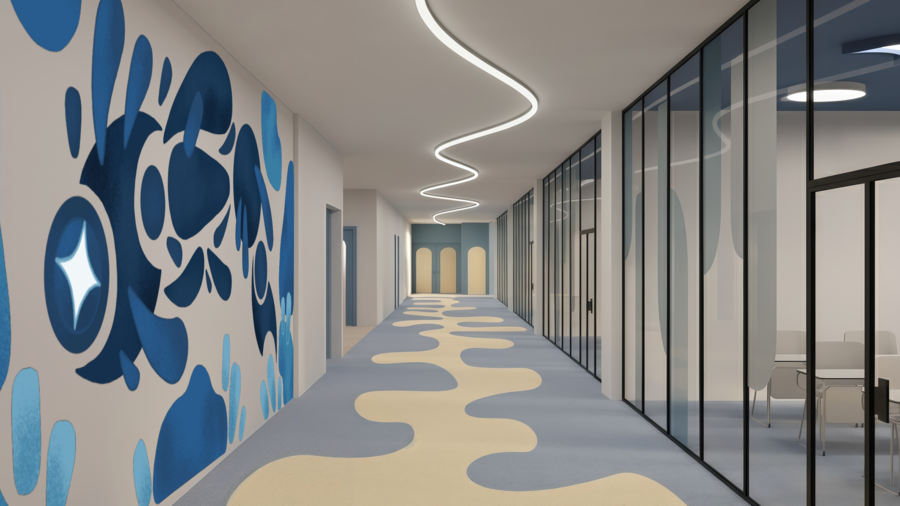 Иллюстрации размещены в рекреациях и коридорах, создавая атмосферу света и движения, не отвлекая от учебного процесса