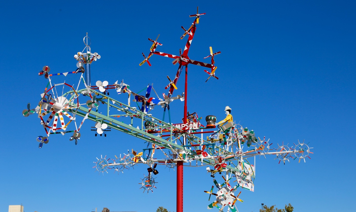 Вертушки — это техногенный лес, где более 30 гигантских, сложных структур, достигающих 15 метров в высоту, приводятся в движение ветром. Воллис Симпсон, фермер и механик, использовал исключительно техногенный лом: списанные дорожные знаки, велосипедные части, вентиляторы, металлические трубы и обломки техники, которые остались у него после ремонта различного оборудования. Он начал строить вертушки, чтобы украсить свою ферму и обеспечить себе занятие после выхода на пенсию. Его работа является актом самореализации и ностальгии. Вертушки Воллиса Симпсона — это пример того, что общество может прославлять чистую художественность и уникальность формы как первостепенный критерий. Это межгалактический паркинг, плотно заставленный фантастическими звездолетами.