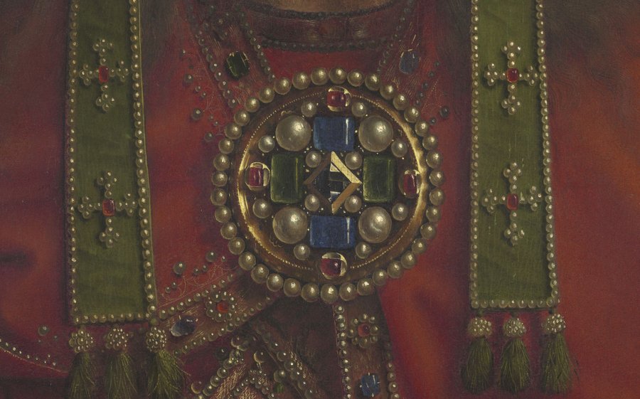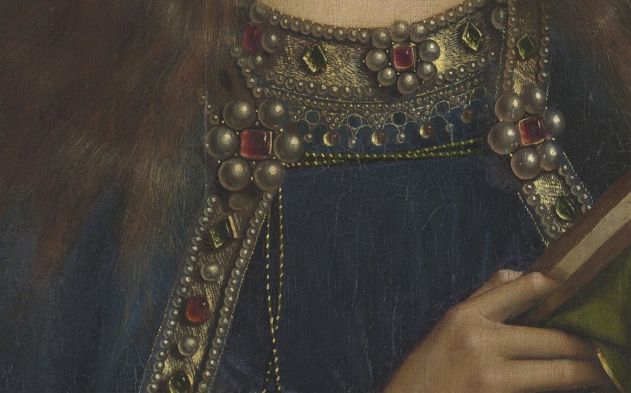 Технически Мемлинг достигает этого эффекта благодаря предельной проработке светотени. Поверхность бортика написана так, будто он обладает собственной материалностью: на нем есть мягкие рефлексы, едва заметные бликовые точки и деликатные переходы тона, формирующие логическую для глаза текстуру.