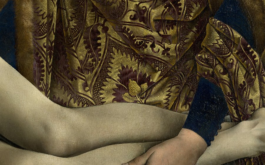 Эффект возникает от столкновения этих двух оптических режимов. Матовые ткани выступают фоном, в котором свет не распространяется свободно; они создают ощущение тяжести, материальности, земной плотности. На этом фоне сияние тела Христа становится почти болезненно заметным. Ван дер Вейден использует микроскопические переходы тона и точечные блики, чтобы создать впечатление, будто на коже задерживается последний, уходящий свет — не как символ славы, а как знак уязвимости. Это свет, который умирает вместе с телом.