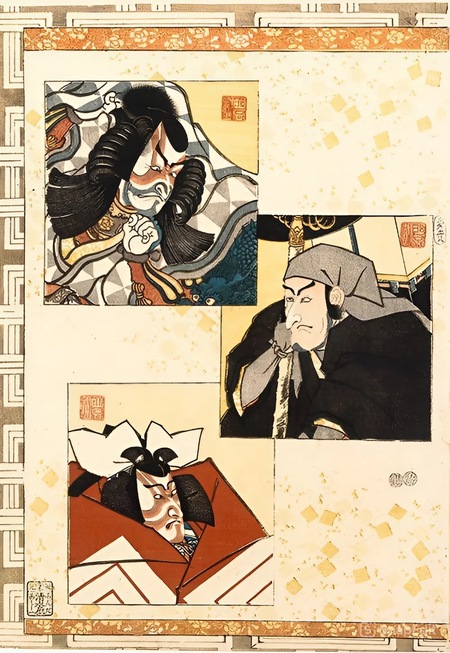 Грим — это «маска 2.0», использующая тот же цветовой код (красный = доблесть, синий = зло) для стандартизированной идентификации. Портреты актеров Итикавы Дандзюро IV и V