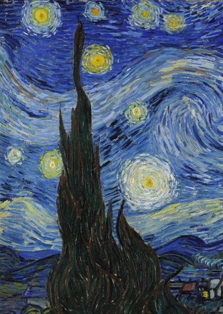 Перейдем к завораживающей картине Винсента Ван Гога «Звездная ночь». Написана в июне 1889 года в больничной мастерской в Сен-Реми-де-Прованс. Является одним из самых известных и значимых произведений художника и всего постимпрессионизма. Полотно изображает вид предрассветного неба над воображаемым городом, каким его видел Ван Гог через окно своей комнаты. «Звездная ночь» наполнена движением: вихри звезд и Луны, извивающиеся линии и яркие светящиеся точки создают ощущение динамики и живого космоса. На переднем плане — высокие кипарисы, тянущиеся к небу, символизирующие связь земли и небес, а внизу — спокойный, погруженный в сон город.