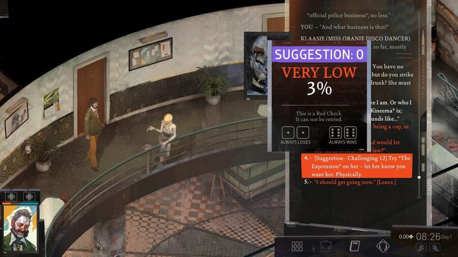 Результаты броска костей: успешный и проваленный (запрограммированно), Disco Elysium, ZA/UM, 2019