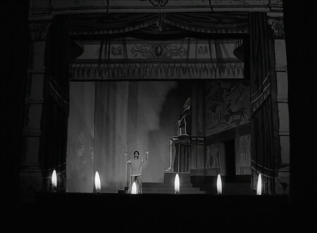 Крупный план — кинематографический прием, который подчеркивает театральные элементы — режиссер акцентирует внимание на мимике героев. Также с помощью крупных планов создается видимость своеобразного «луча», освещающего и выделяющего героя в темном пространстве театра. Именно на этом герое, его языке тела, движениях и речах сосредоточено внимание зрителя.
