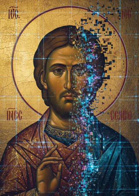 Представленная схема-триптих «ТРАДИЦИЯ → ТЕХНОЛОГИЯ → СОВРЕМЕННОСТЬ» наглядно иллюстрирует этот процесс: слева — классическая икона, символизирующая корни и сакральный канон; в центре — визуализация кода, как метафора инструмента и механизма трансформации; справа — работа: vtol:, показывающая современный результат: живое, изменчивое и интерактивное искусство.