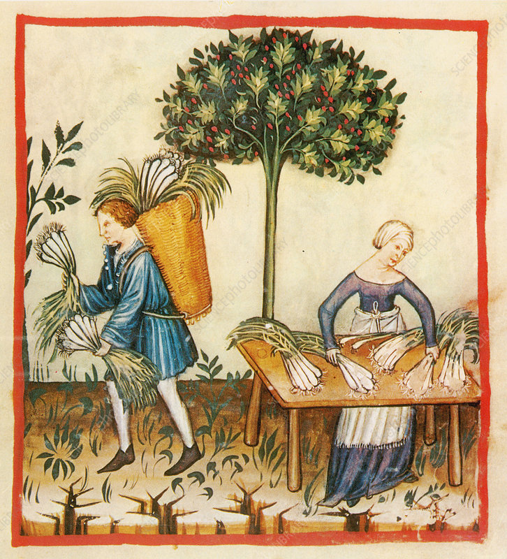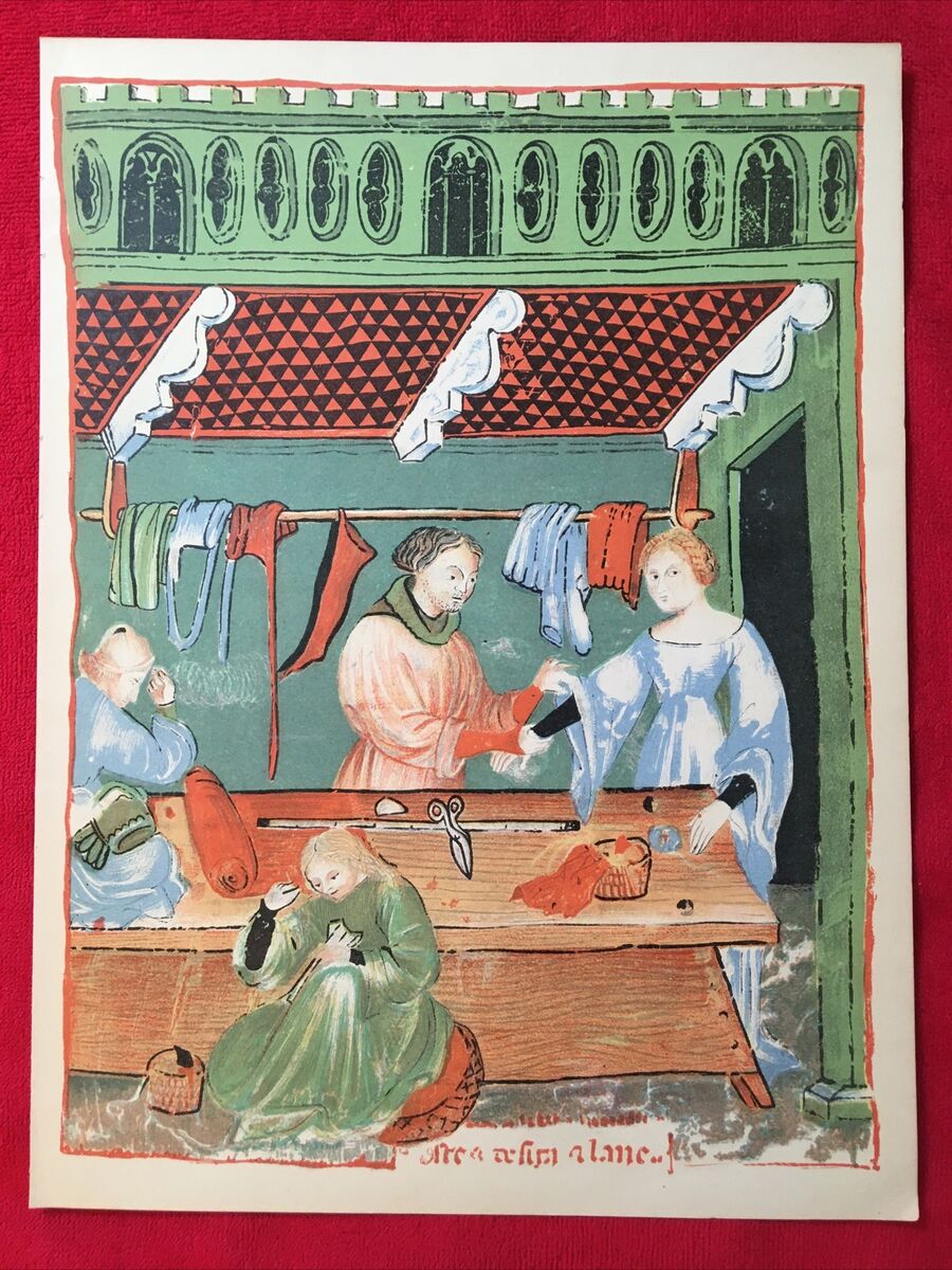 В раннем Средневековье торговля практически не становилась предметом живописи в привычном смысле — её изображение присутствовало, в первую очередь, в нравоучительных и нравоучительных манускриптах. Например, в трактате «Tacuinum Sanitatis» (XIV век, но основан на арабских источниках IX века, созданных багдадским учёным и врачом Ибн Бутланом), можно увидеть сценки с продавцами одежды, сыра и рыбой. Эти миниатюры одновременно имели образовательное и декоративное значение.